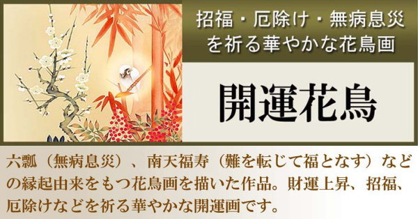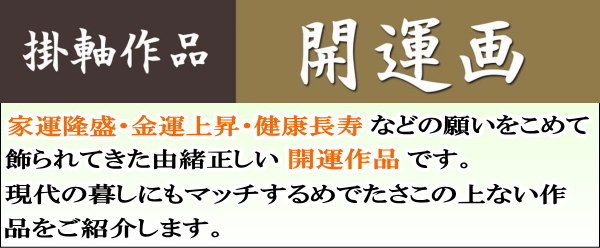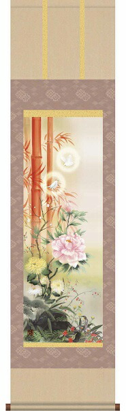 かの楊貴妃に珍重され、富貴花と称えられた大輪の「牡丹」を中心に、朱竹、白梅、菊、そして難を転ずる「南天」と、春夏秋冬を代表する吉祥の銘花を一堂に描き上げました。華やかな吉祥の趣が一年を通してお部屋いっぱいに広がる艶やかな作品です。