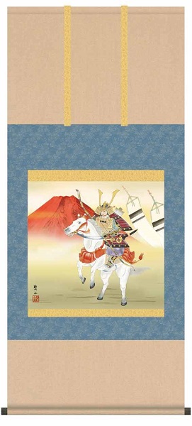 【お得クーポン配布中】 掛け軸/節句画/武者・兜/白馬武者/唐沢碧山/草夕会/洛彩緞子本表装/尺五サイズ幅54.5cm/桐箱畳紙収納/表装品質十年保証/端午の節句掛軸 初節句 こどもの日