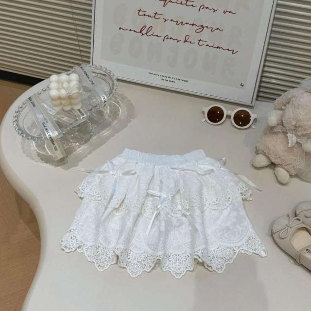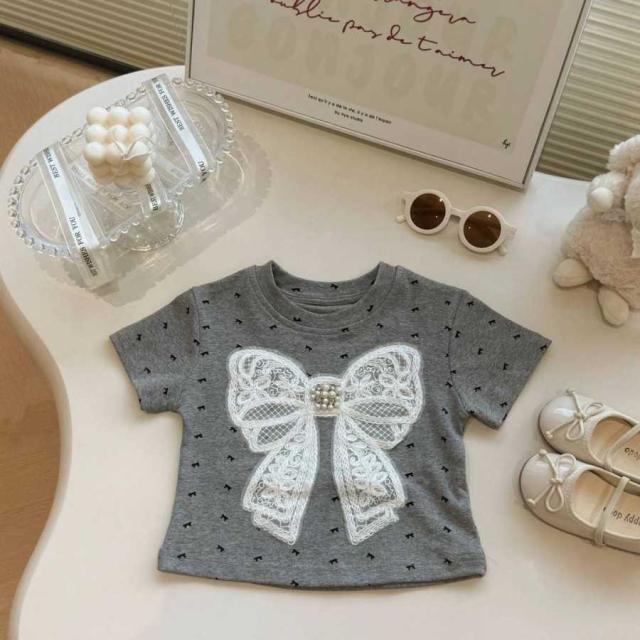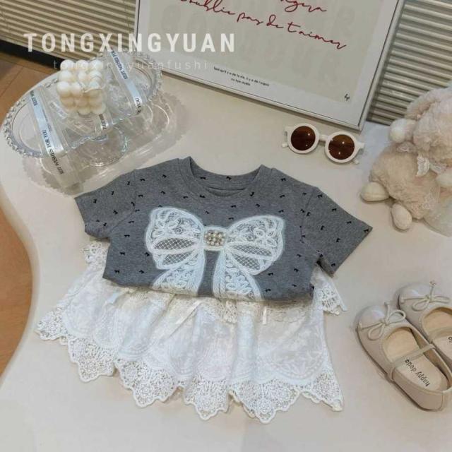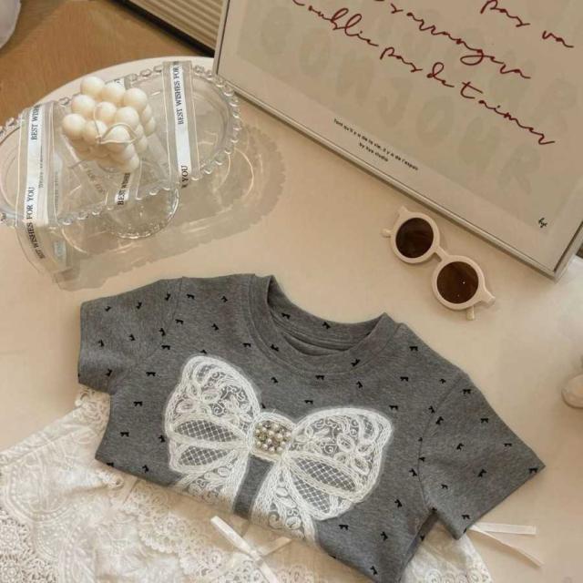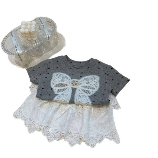女の子 キッズ服 子供服 tシャツ スカート グレー ホワイト 蝶結び 森ガール系 2点セット お出掛け 夏 新作 可愛い 新品 韓国風 1-6歳