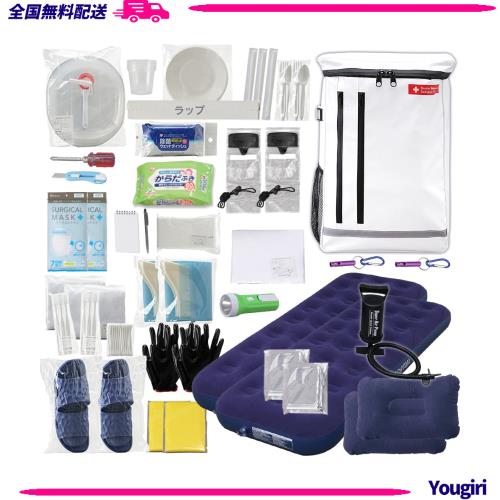 ▼セット内容/リュック含む合計42点 懐中電灯ランタン(単3形乾電池×2本・別売り) エアベッド×2個、アルミブランケット×2枚、エアベッド用ポンプ、エア枕×2個 携帯用トイレ3個×2セット、綿棒×20本、マスク(ふつうサイズ)7枚入り×2セット、歯ブラシ3本×2セット、からだふきシート50枚入り、ティッシュペーパー、ウェットティッシュ10枚入り×3個 ラップ、プラカップ×5個、ウォータータンク5L、割りばし×3膳、スプーン・フォークセット×2セット、紙皿×3枚 レインポンチョ×2着、ラバー手袋×2セット リュック、ボディタオル×2枚、ポリ袋、EVAサンダル(26cm)×2足、ホイッスル×2個、筆記用具セット、防水スマホ袋×2個、カッターナイフ、2WAYドライバー