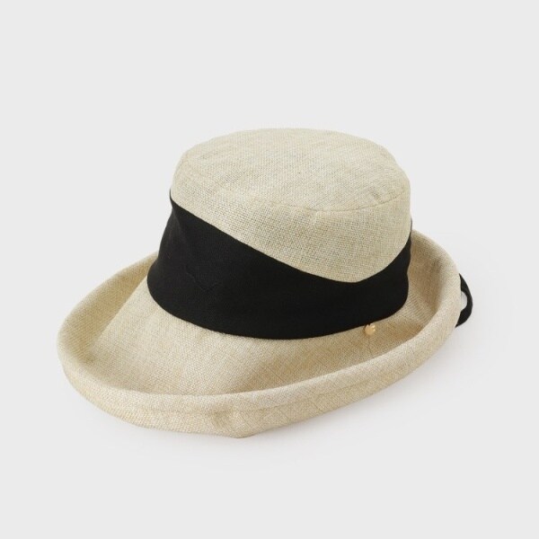 麻調素材に異素材の巻きをデザインした涼やかなデザインのハット。