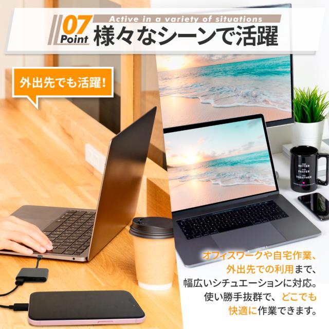 これひとつで映像出力・データ転送・充電(最大100W)ができるため、外出先でもスマートに活躍!