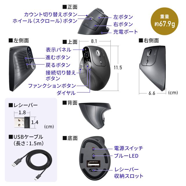 ■ボタン:左・右クリック、ホイール(スクロール)ボタン、戻るボタン、進むボタン、ダイヤル、ファンクションボタン、接続切替えボタン、カウント切替えボタン