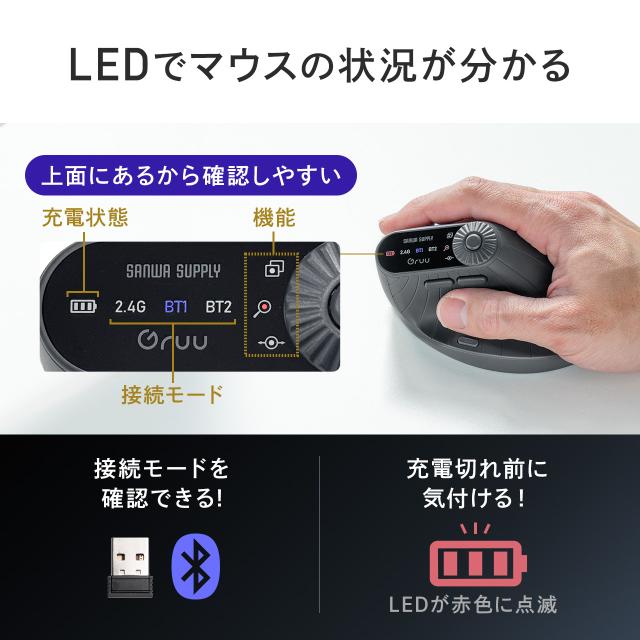 ●マウスのLED表示で、充電状態、接続モード、選択している機能の3つの状態が確認できます。