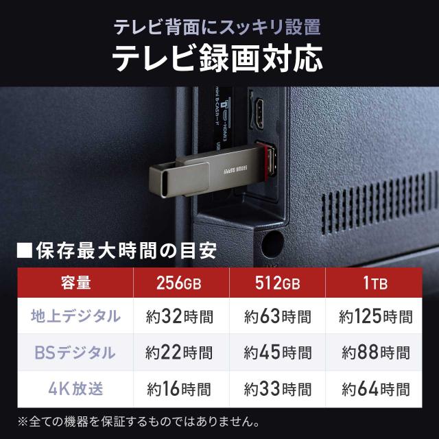 ※テレビで使用する場合は録画用のUSBポートに接続してください。デジタルカメラ接続用や保守用のUSBポートでは使用できません。