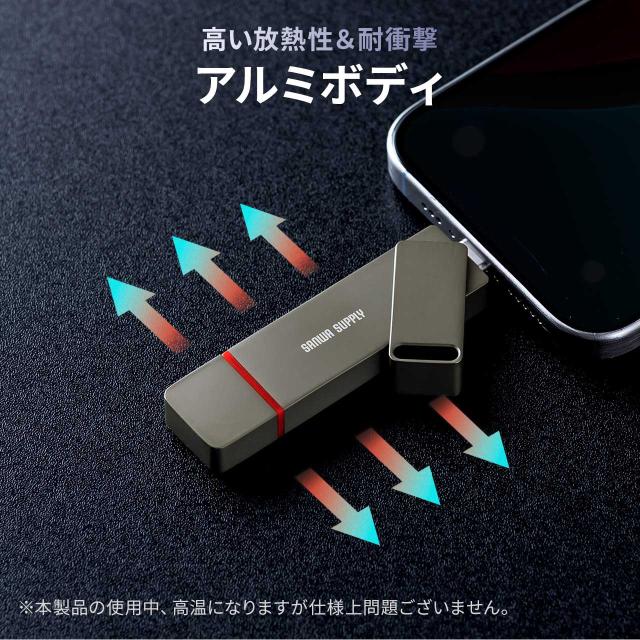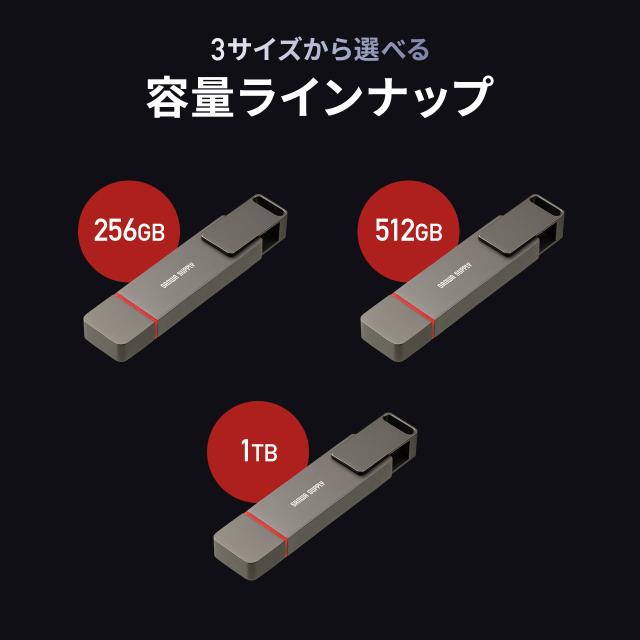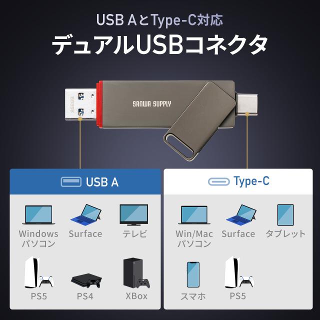 スティックSSD 256GB 読み込み最大 1000MB/s USB A / Type-C コンパクト ポータブル 外付け 超小型 PS5 テレビ録画 アルミ筐体 USB-C ガンメタリック[600-USSC256GB]