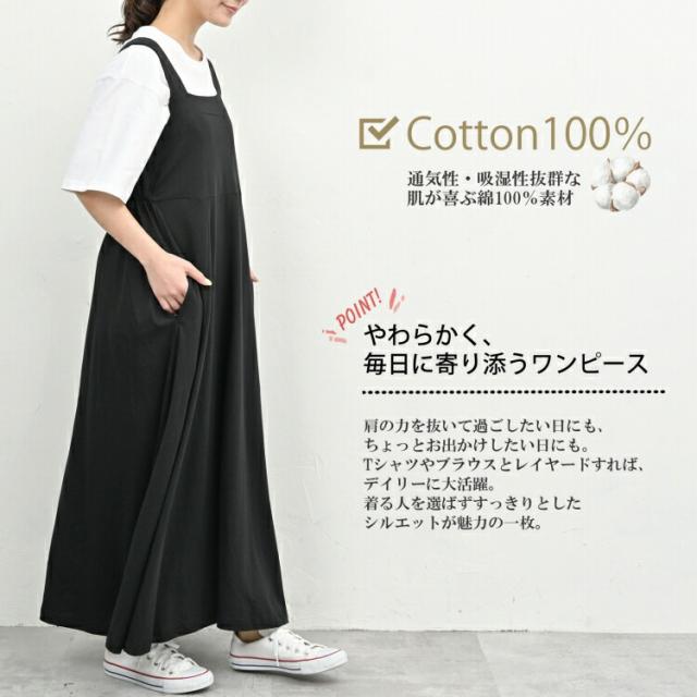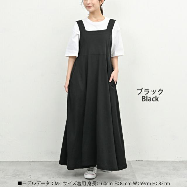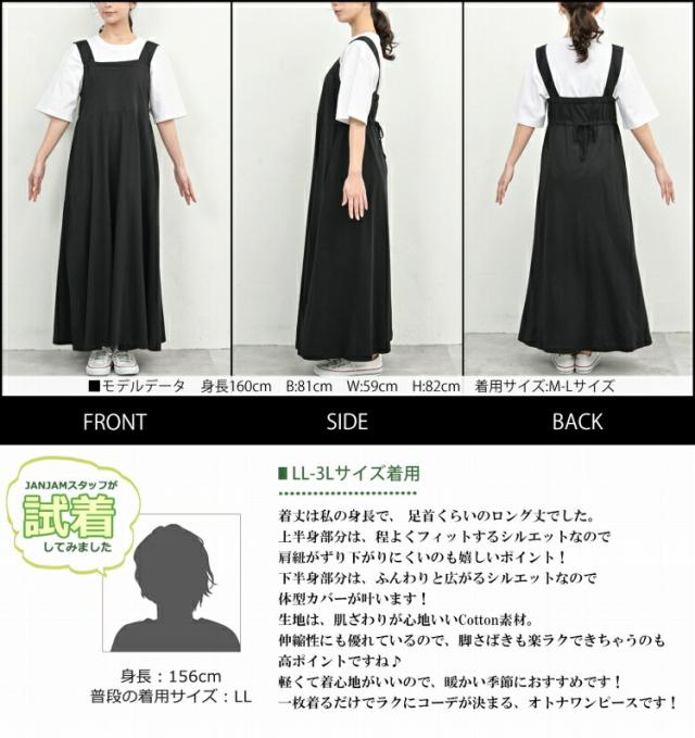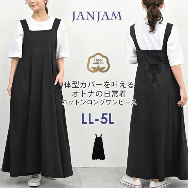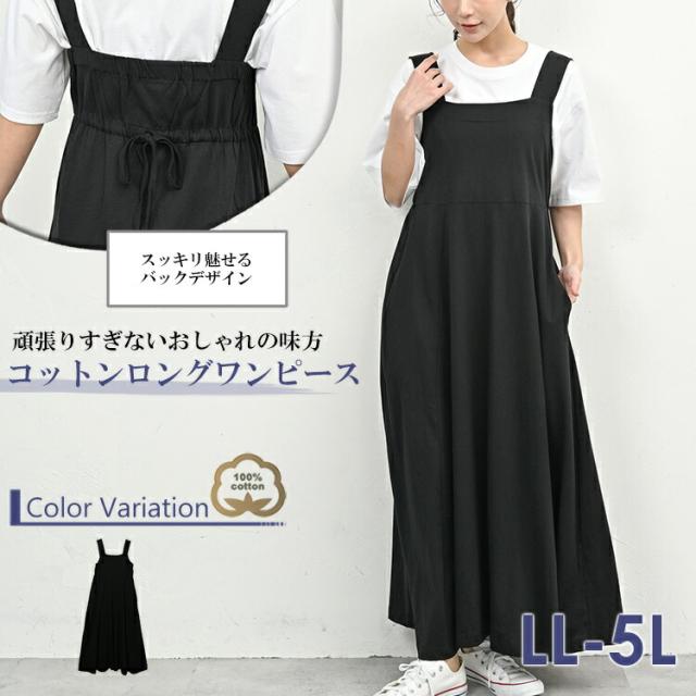 大きいサイズ レディース ノースリーブワンピース ロング丈 サロペットスカート バックギャザー cotton100 LL-3L/4L-5L ゆったりサイズ ぽっちゃり女子 プラスサイズ