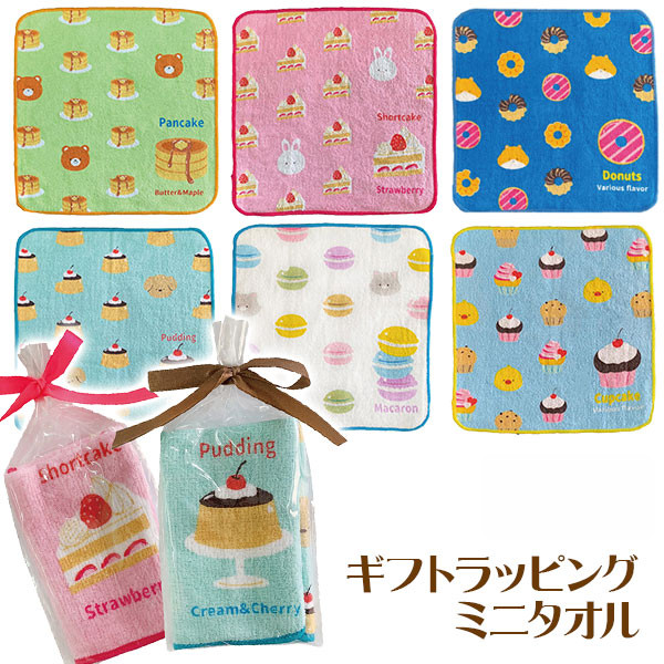 スイーツ&アニマルデザインのミニタオルです♪ラッピング済なので、ちょっとしたプレゼントにも最適!コンパクトサイズで持ちやすく、折りたたんでポケットに入る大きさです。