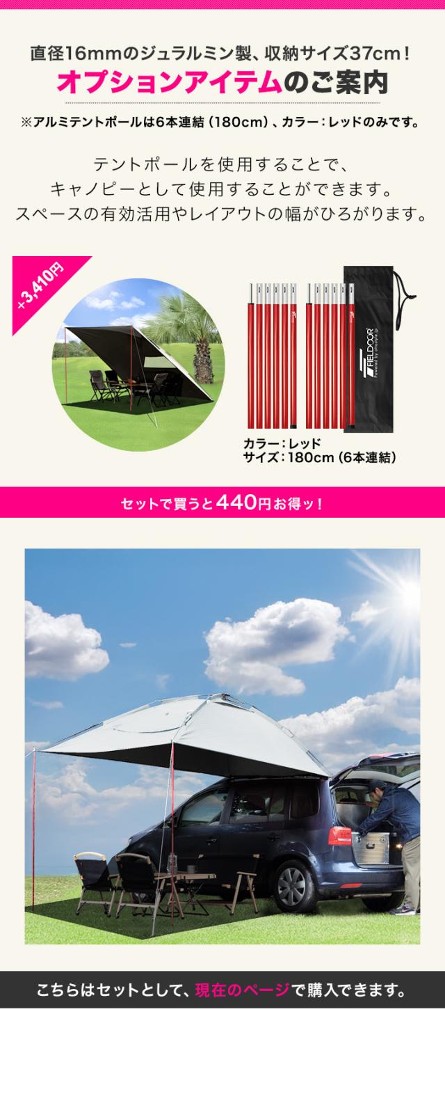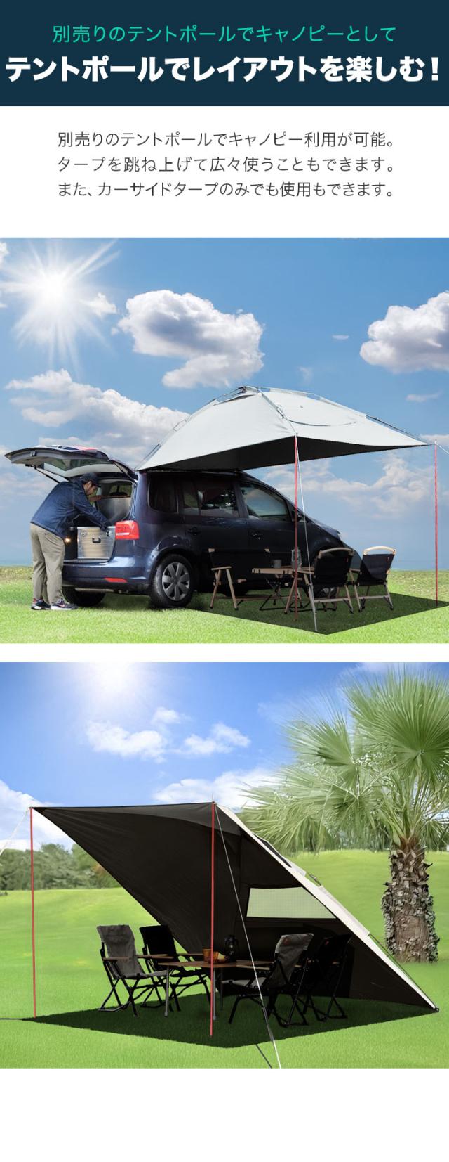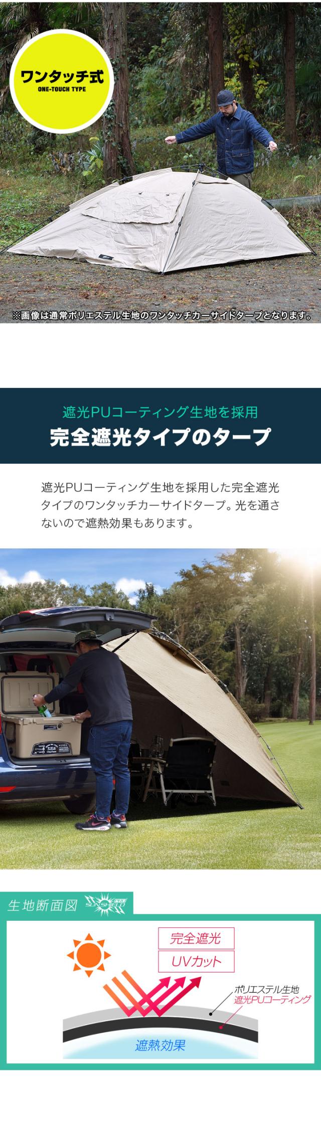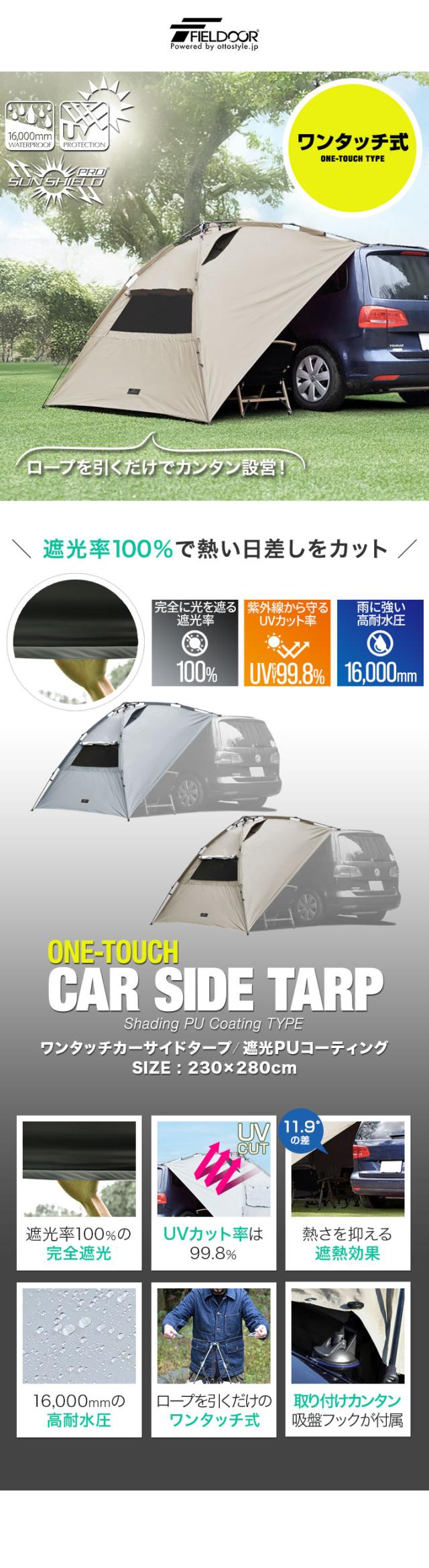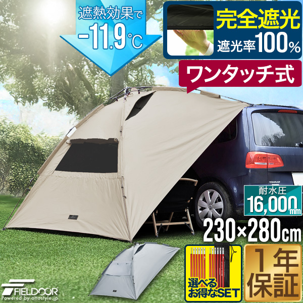 FIELDOOR ワンタッチ カーサイドタープ 遮熱 遮光 230cm×280cm 車用 タープ テント UVカット 耐水 吸盤 車中泊 オートキャンプ ミニバン SUV 軽自動車 連結 日よけ シェード サイドオーニング カーサイドテント アウトドア 1年保証 送料無料