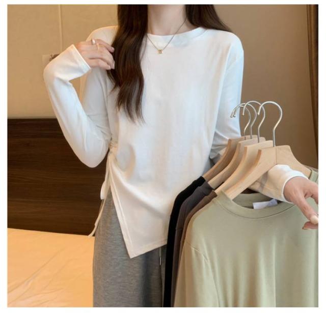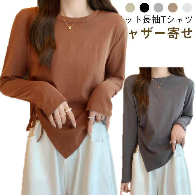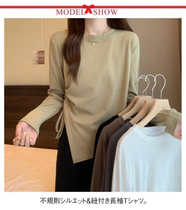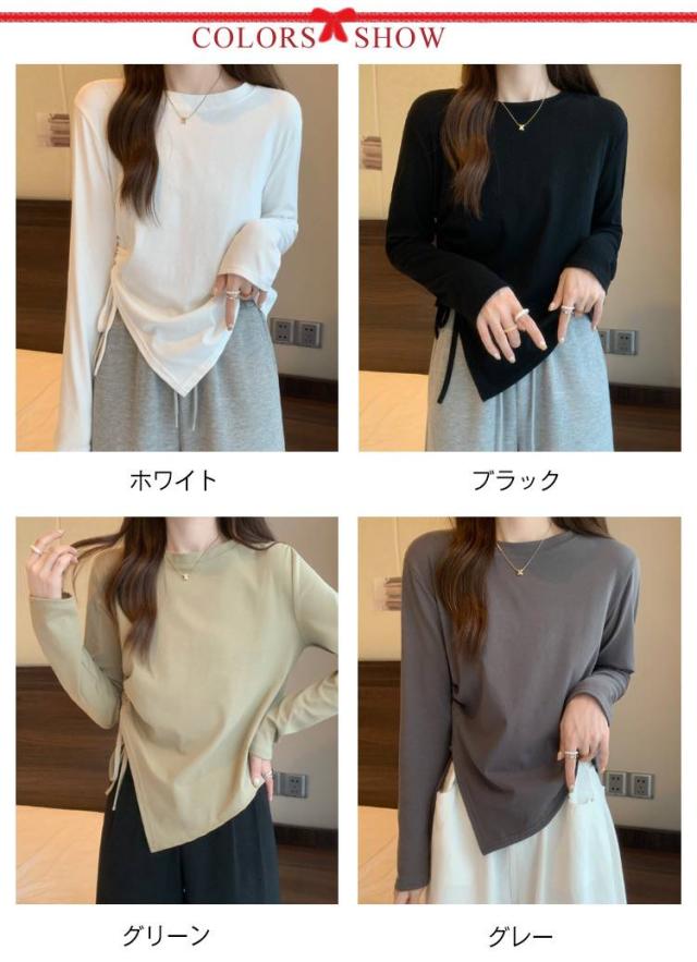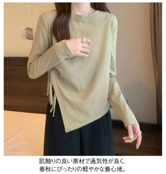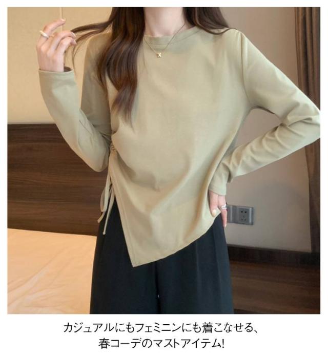 長袖Tシャツ レディース サイドギャザー カットソー 無地 tシャツ 長袖 トップス 女性 春 秋 スリット シンプル おしゃれ 全5色 送料無料