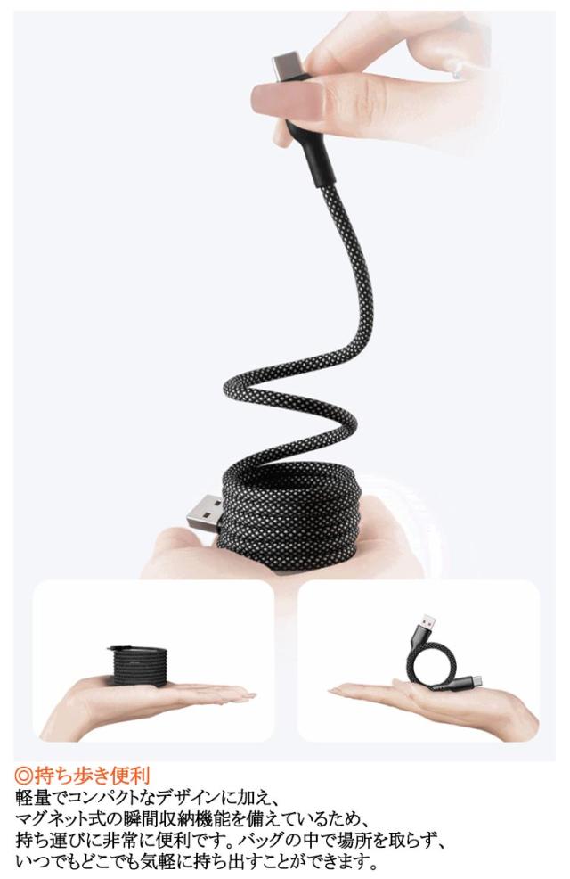 | 2本入り!1/1.5/2m選べる! ◎マグネット吸着式瞬間収納 この充電ケーブルは、マグネット式の収納機能を備えています。使用後は簡単に端末から取り外し、ケーブルが自動的にコンパクトに収納されるため、煩わしい絡み合いや持ち運び時の不便を解消します。いつでもどこでもスムーズに収納・持ち運びが可能です。 ◎最大100W急速充電対応 最新の技術を採用したこの充電ケーブルは、最大100Wの出力に対応しています。対応するスマートフォンやタブレット、ノートパソコン等を驚くほど速く充電可能。短時間での急速充電が求められる現代人のニーズに応えます。 ◎多種インターフェースあり USB Type-C、Lightning、Micro USB(USB-A)といった複数の主要インターフェースに対応しているため、様々なデバイスに幅広く対応。 ◎抜群な断線防止耐久構造 高品質な素材と強化された構造により、折り曲げや引っ張りに強い設計が施されています。日常の使用においても断線の心配が軽減され、長期間にわたって安心して使用することができます。 ◎E-Makerチップ内蔵 E-Makerチップを内蔵することで、充電中の電力管理が最適化されます。デバイスへの過充電や過熱を防ぎ、充電効率を高めるとともに、デバイスのバッテリー寿命を延ばすことに貢献します。 ◎持ち歩き便利 軽量でコンパクトなデザインに加え、マグネット式の瞬間収納機能を備えているため、持ち運びに非常に便利です。バッグの中で場所を取らず、いつでもどこでも気軽に持ち出すことができます。 | |