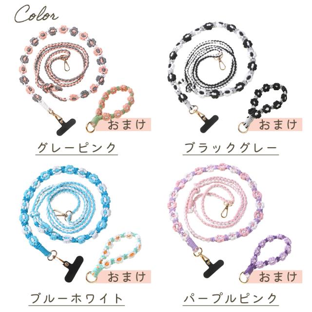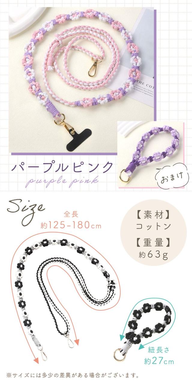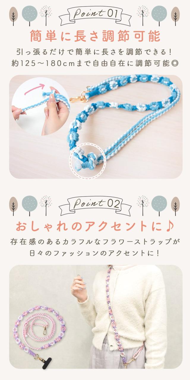 ショルダーストラップ/かわいい/ケースに挟み込み/ファッション/おしゃれ/長さ調節/125センチ/180センチ/ホルダー付き/花柄/レディース/大人/首掛け/ネック/斜め掛け/フラワー編み/手編み/ハンドメイド/手作り/プレゼント/ひも/全機種対応/アイフォン/スマホ/スマートフォン/携帯ストラップ/Galaxy/AQUOS/Xperia//iPhone/Android/マクラメ編み/鍵/パスケース/紛失防止/落下防止/おまけ/TN-FSPS