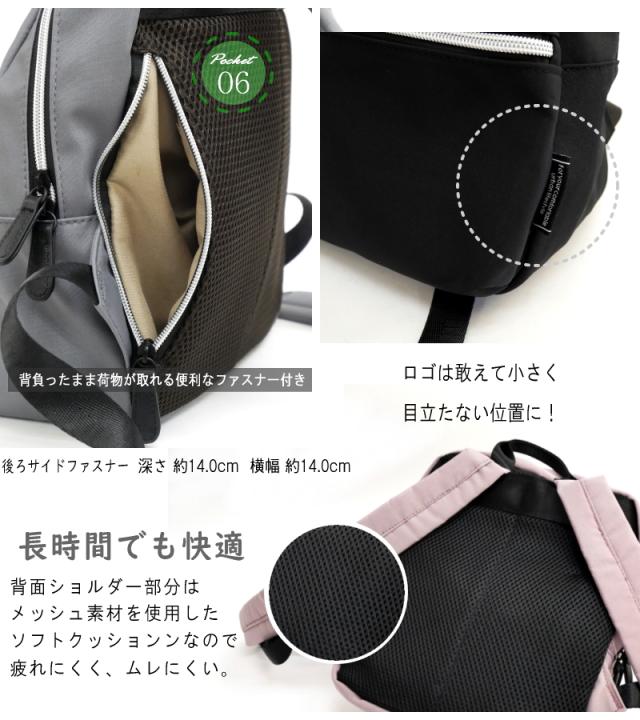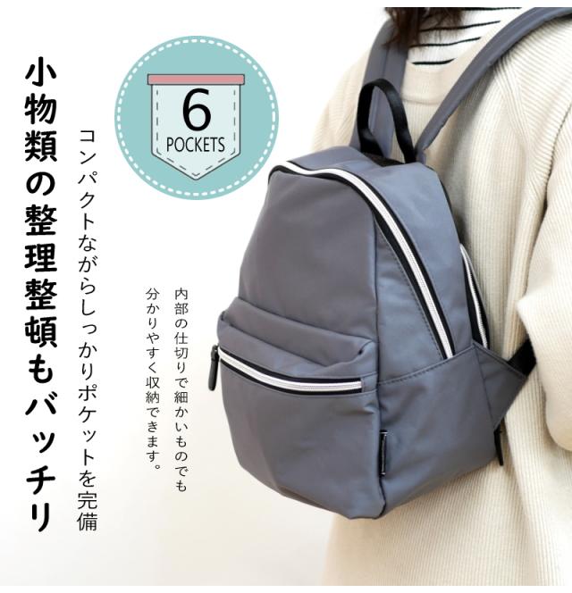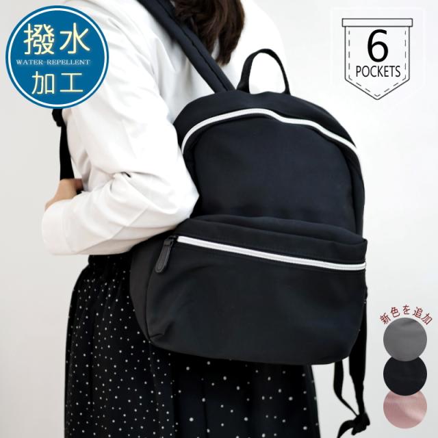 リュック 撥水加工 軽量 小さめ 多収納 機能的 6ポケット マザーズバッグ デイパック タウンユース 雨の日 紐調節 黒 グレー スモーキーピンク 持ちやすい 通勤 通学 通年 シンプル