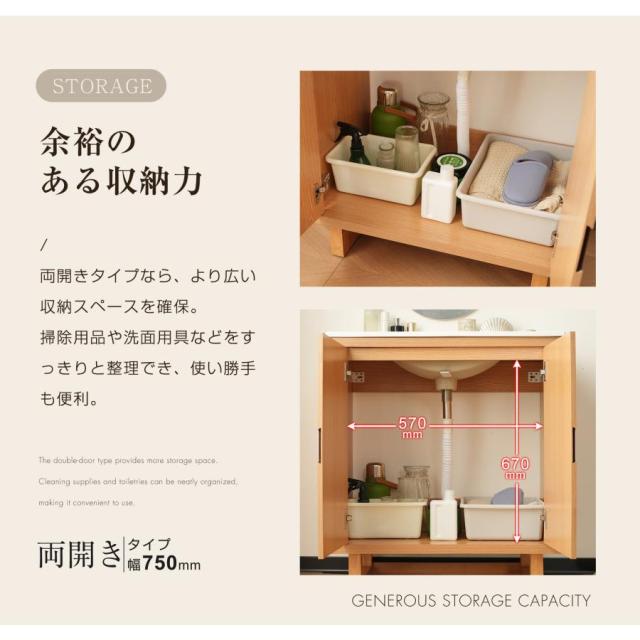 【余裕のある収納力】両開きタイプなら、より広い収納スペースを確保。掃除用品や洗面用具などをすっきりと整理でき、使い勝手も便利。