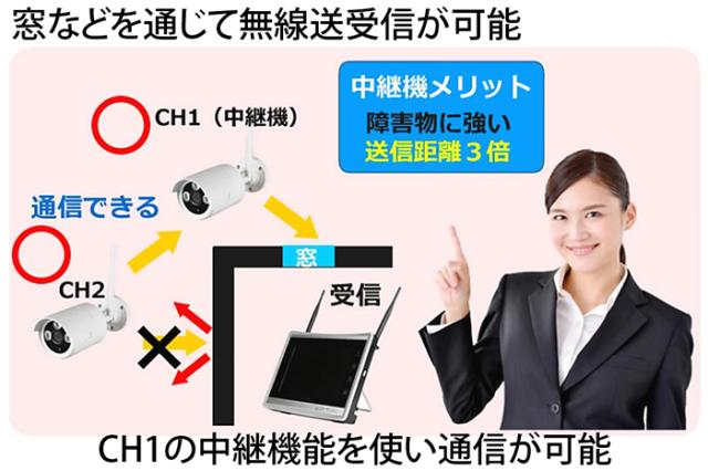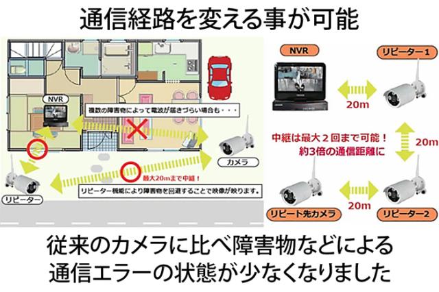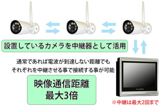 リピーター機能(中継機能)付きのワイヤレスカメラ(無線カメラ)は、カメラ自身が中継器となり、カメラ同士の通信を中継する事が可能です。