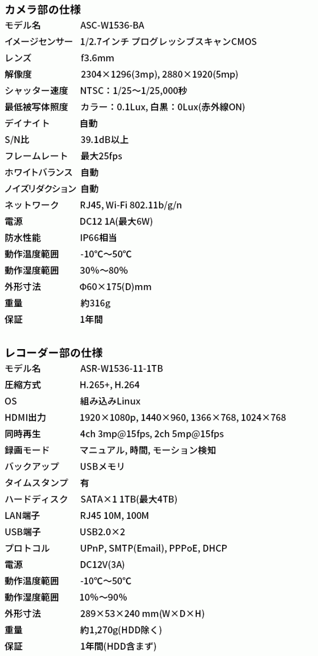 ※防犯カメラ2台セット[ASR-W1536-11B-SET2]、防犯カメラ3台セット[ASR-W1536-11B-SET3]、4台セット[ASR-W1536-11B-SET4]のご用意もございます。
