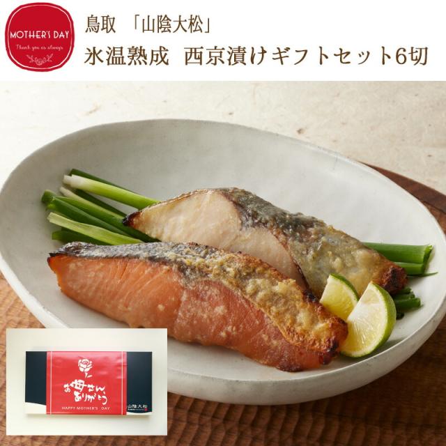 鳥取 「山陰大松」 氷温熟成 西京漬けギフトセット6切| 特性の味噌床と氷温熟成製法で素材の旨みを引き出した西京漬けのギフトセット。柔らかな身から溢れ出す魚の旨みと、身の隅々まで染み渡った上品な味噌の味の重なりを是非ご賞味下さい。 | 商品の詳細情報 | ■商品内容 | 銀ひらす西京漬け60g×2、鯖西京漬け60g×2、秋鮭西京漬け60g×1、さわら西京漬け70g×1 | ■アレルゲン(7品目) | 無 | ■賞味期限 | 出荷日より60日 | ■お届け日 | 5月9日〜5月11日 | ■配送方法 | 冷凍 | ※配送業者のご指定は承れません。 ■用途 | 母の日/和菓子/洋菓子/スイーツ/グルメ | ■ご注意ください! | 他の商品とご一緒のお届けはできません。他の商品とご一緒にご注文いただいた場合は、別便でのお届けとなり、別途送料がかかります。 | | |||