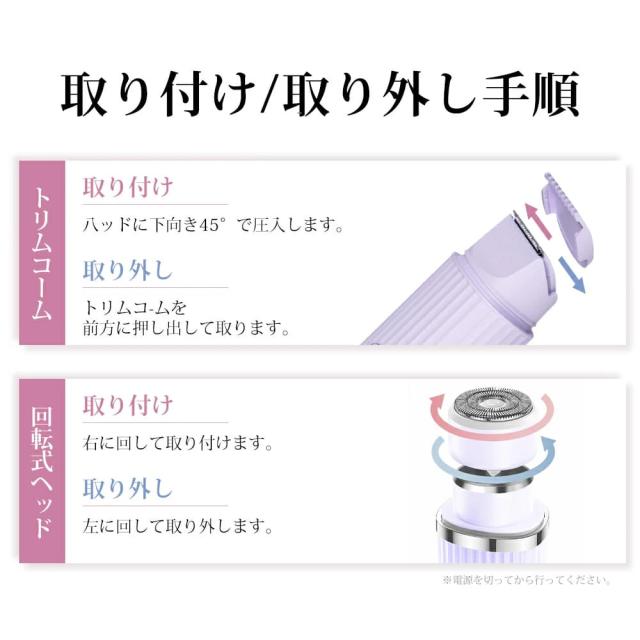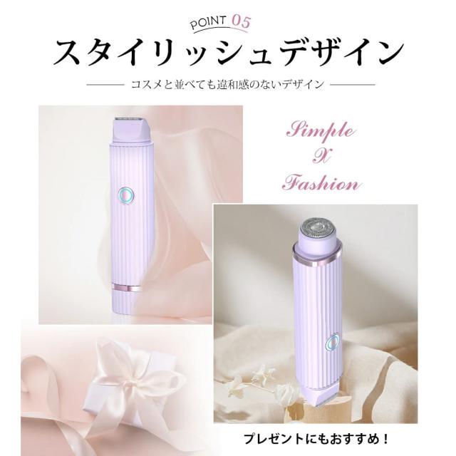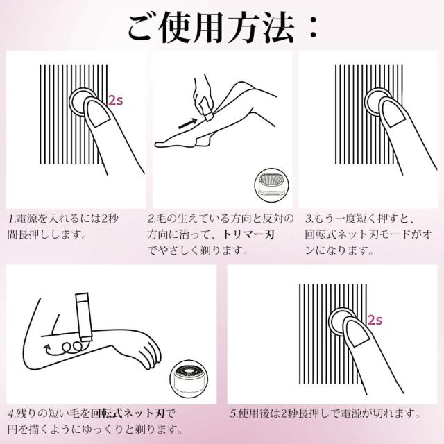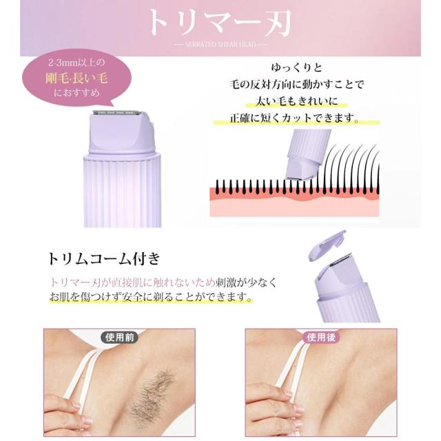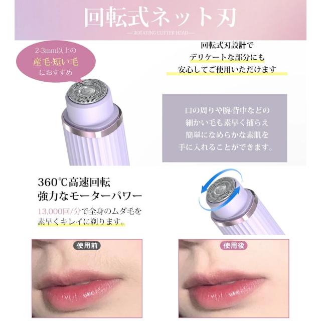【1台2役でヘッド交換不要全身に使える】ムダ毛ケアをしたい部分は、顔周りから足の指先まで人によってさまざまな部位のケアが必要です。本商品にはトリマー刃、回転式ネット刃の2つの刃が付いてあり、顔周りのうぶ毛や眉毛をはじめ、ワキやvio、腕や足など全身にお使い頂けるシェーバーになります。