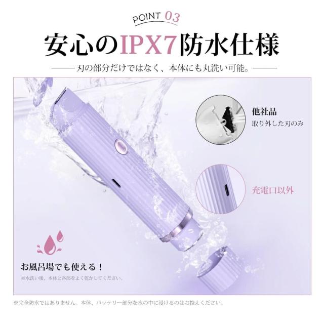 【IPX7防水乾湿両用・水洗い可能】 IPX7防水加工されて乾湿両用で、お風呂でも使用可能。風呂に入った後、温まって肌が柔らかくなるので、脱毛しやすく、やさしい感触です。使用後、付属の清掃用ブラシを使って、内側のムダ毛を掃き出して下さい。お手入れも簡単でいつでも衛生を保つ。※製品の本体を長時間に水の中に浸さないでください。