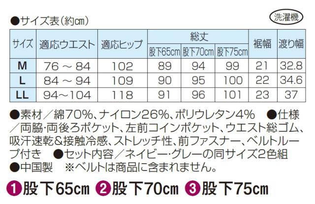 ●仕様/両脇・両後ろポケット、左前コインポケット、ウエスト総ゴム、吸汗速乾&接触冷感、ストレッチ性、前ファスナー、ベルトループ付き