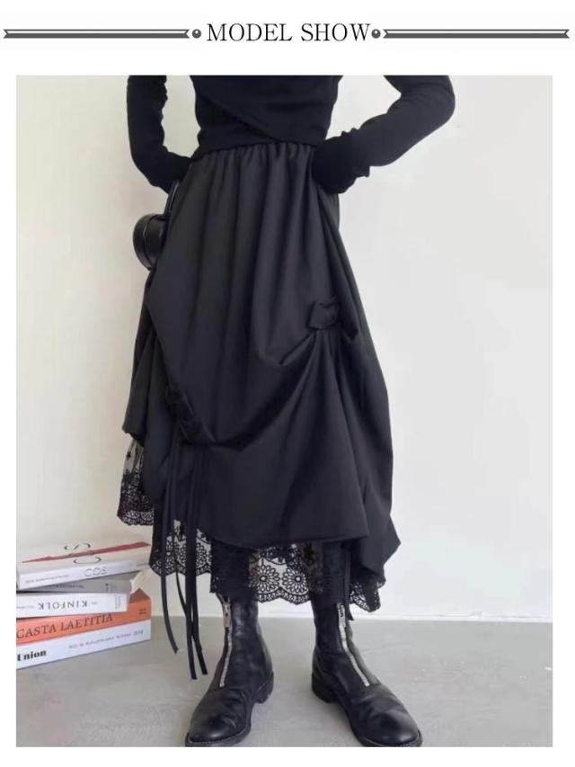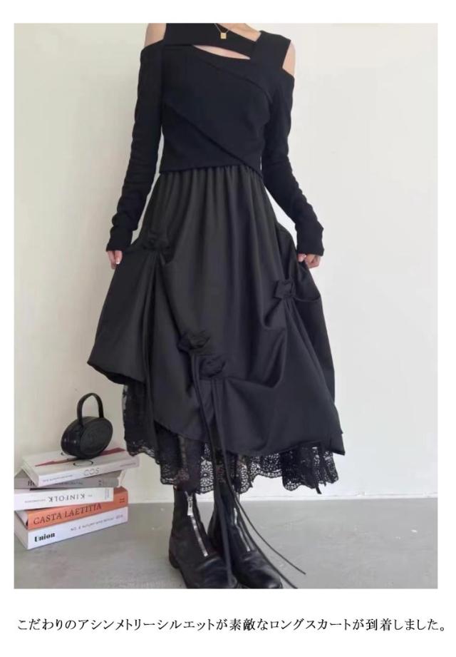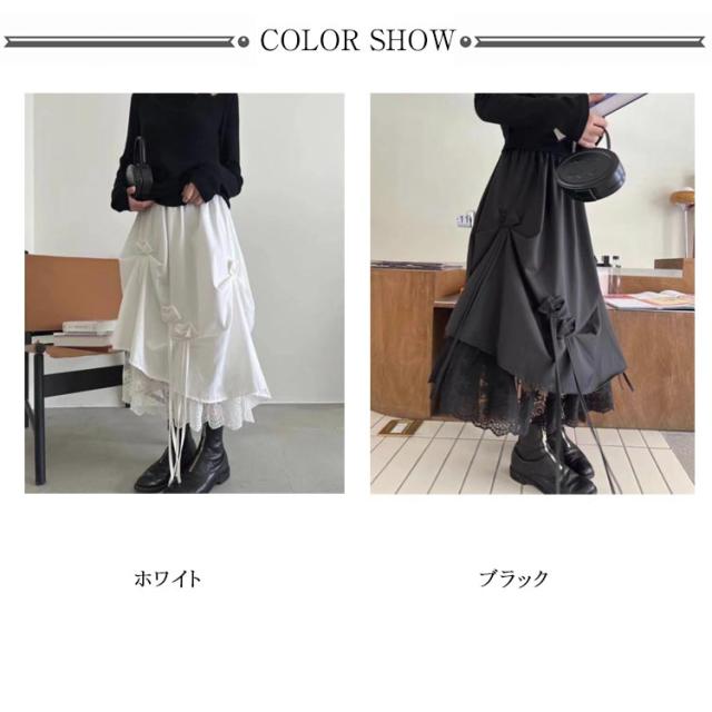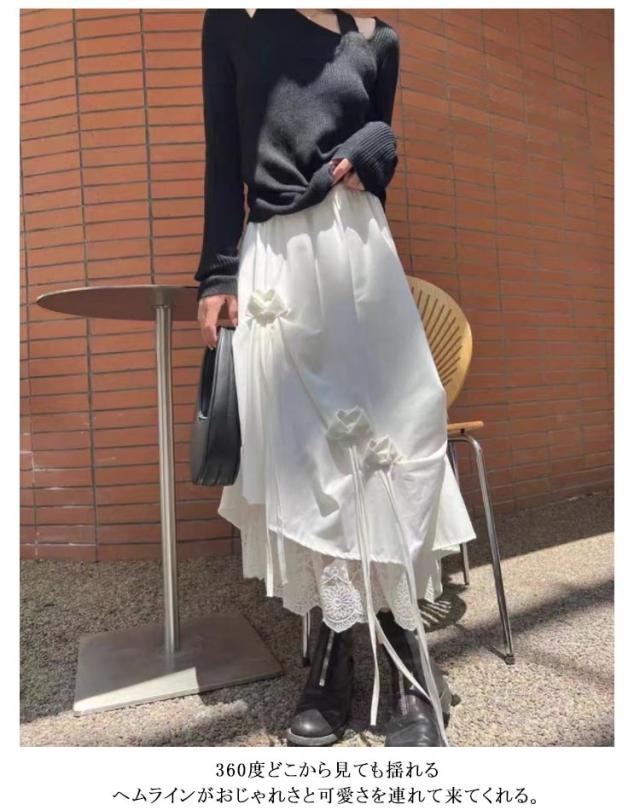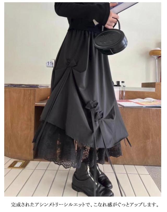 白 レディース スカート 夏 春 秋 レース切り替えヘムライン ボトムス 裾変形デザインスカート ミモレ丈 フレアスカート 冬 ブラック 黒 ホワイト アシンメトリー ロングスカート ウエストゴム 調節 ひざ下 ゆったり きれいめ