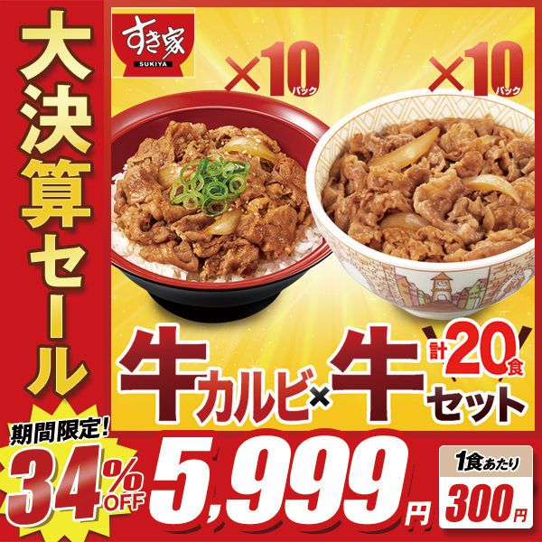 1食300円!!34%OFF!!大決算セール!!!すき家 2種 計20パックセット 牛カルビ丼の具 10パック × 牛丼の具10パック【送料無料】【冷凍(クール)】