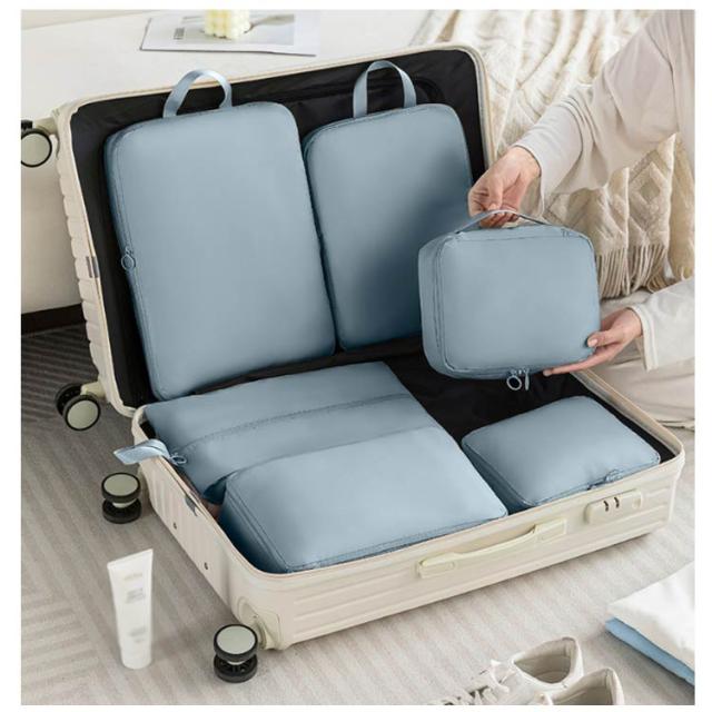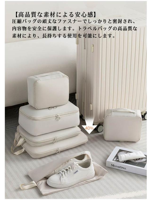 | 持ち運びに便利な取っ手付き 【簡単圧縮 】道具を使わずあっという間に圧縮できるので、整理整頓が苦手でいつもパッキングに時間がかかってしまう方にもおすすめです。従来の圧縮袋と違い、繰り返し何度も使用できるので環境にやさしく経済的。 【実用性が強い】トラベルポーチセットは出張、旅行だけでなく、温泉、スポーツ、キャンプなどのアウトドア、日常の衣類収納としても重宝します!使わない時はコンパクトに保管できます。 【撥水加工】濡れた時も中身が安心な撥水加工生地。 【高品質な素材による安心感】圧縮バッグの頑丈なファスナーでしっかりと密封され、内容物を安全に保護します。トラベルバッグの高品質な素材により、長持ちする使用を可能にします。 | |