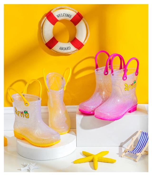 | シンプルなデザインのキッズレインシューズ。コットンインソールが付属しており、レインブーツをより快適に履くことができます。 どろんこ遊びや砂場・水遊びでも足元がぬれなくて、大活躍!寒い季節なら、ちょっとした防寒用にも! 雨の日も笑顔で通園、通学できるオススメアイテム! スッキリとしたシルエットにキラキラクリアデザインがキュート。 シンプルなクリアデザインにキラキララメが足もとを可愛く演出します。 履き口が大きく、柔らかい素材なので脱ぎ履きが楽ちん。 | |