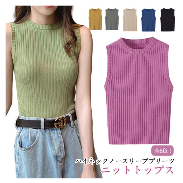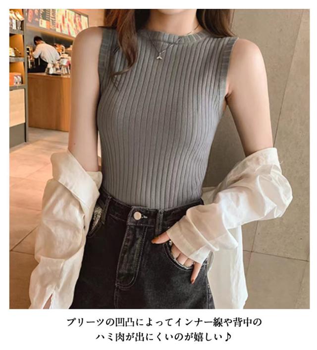 プチハイネック タンクトップ インナー プチハイネック トップス ニット ノースリーブ ノースリーブ プリーツニットトップス リブニット プリーツ レディース ストレッチ トップス ハイネックニット 涼感 さらさら オフィス