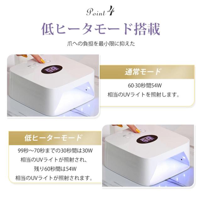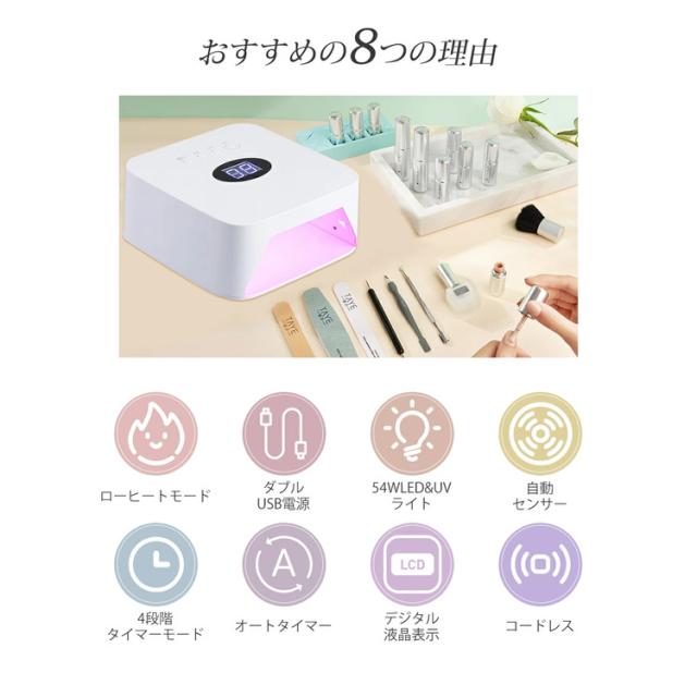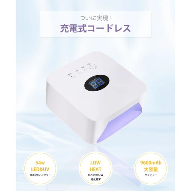 【コードレス】ジェルネイルライト 54W LED&UV セルフネイルライト 低ヒート機能 UVライト ダイソー レジンクラフト 自動センサー 角型ライト 誕生日 クリスマス プレゼント 新年ギフト