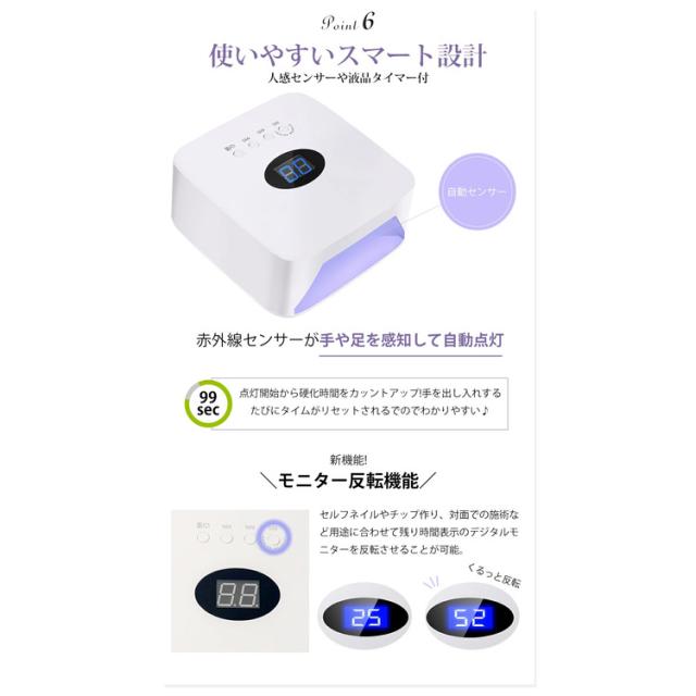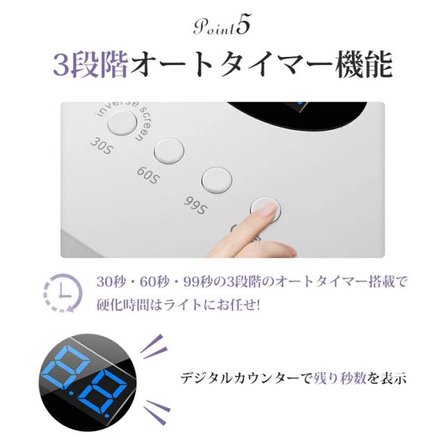 【自動センサー &3段階タイマー表示】赤外線検知システムが搭載され、指先/足を感知すると、センサーが自動でオンになります。手を離すと自動的に消灯します。このゲルネイルライトには、 30秒/ 60秒/ 99秒(低熱モード)の時間設定があります。