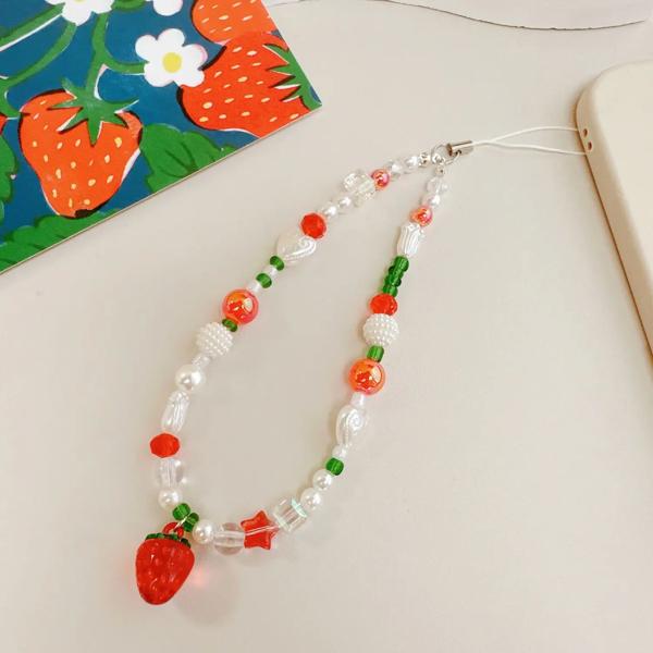 ボヘミアンスマートフォンチャームストラップ、ドロップ防止フォンストラップ、かわいいブレスレット、赤いイチゴ、白いパールビーズ、DIY