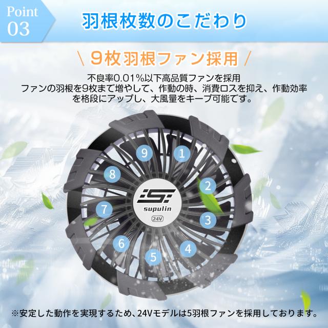 Supulinのクールウェアは2つの小さな高性能ファンが取り付けられている作業服です。 新作ファンは、従来品より風量60%UP、さらにセットで付属のファンには業界最多の9枚羽を採用しております。 ※30V対応ファンは5枚羽です。パワフルなのはもちろん静音で風を生み出します。 また軽量なので、女性や普段使いなどにもぴったりです!