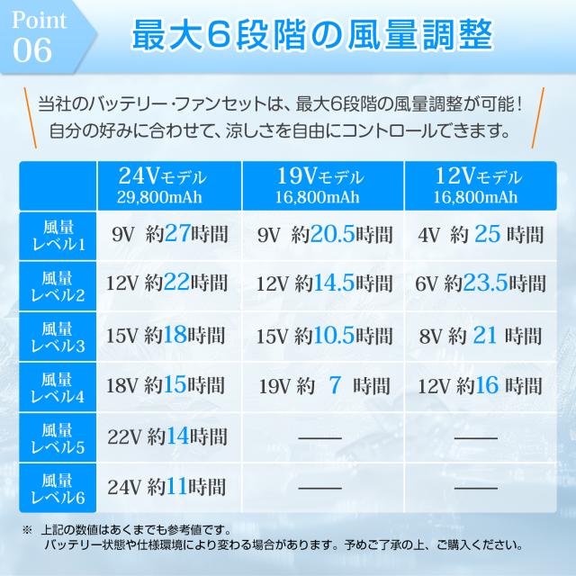 - 片道5〜6kmの徒歩通勤用に購入しました。12Vファンベスト持ってましたが風量イマイチで毎回汗びっしょり。24Vはバッテリー重そうなので悩みつつ19Vにしました。19Vの風量に期待してます。使用後の感...