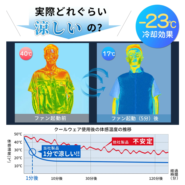 熱中症対策のトレンドアイテム、クールファンベストが登場! スイッチを押すだけで空気を取り込み体中を涼風が駆け巡ります。 外気を取り入れことで、汗の蒸発を促して、体温が有効的に下がります。 素早く汗を蒸発させるので大量の汗をかく不快感を改善できます。 また、汗がすぐに蒸発するので、汗臭が減り、あせもなど、汗による皮膚病になりにくくなります。