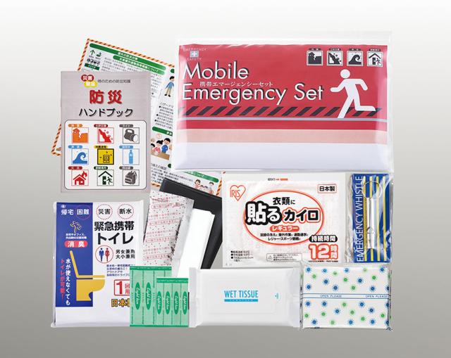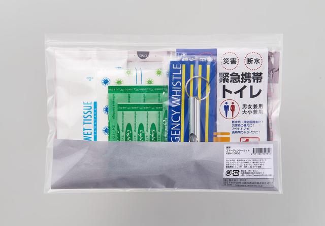 セット内容:チャック付きビニールケース、IDカード台紙、携帯トイレ(大小兼用)1P、ポケットティッシュ、エイトバン(大小×各2)、ホイッスル、ウェットティッシュ(10枚)、使い捨てカイロ、防災ハンドブック