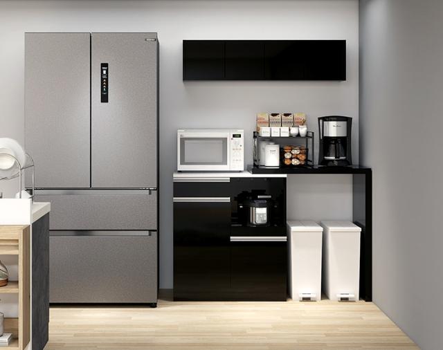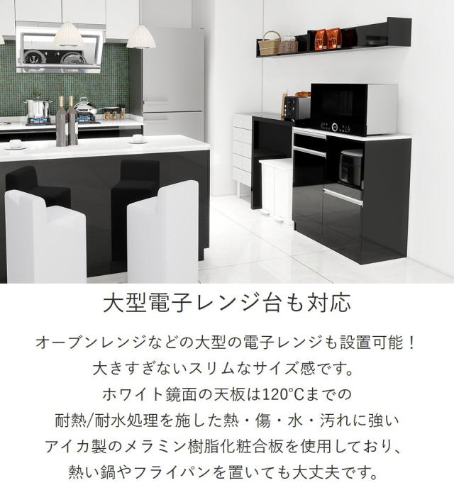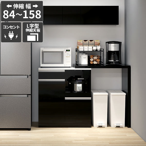 レンジ台 食器棚 キッチンボード 電子レンジ台 おしゃれ ごみ箱収納 伸長 大型電子レンジ対応 コンセント付き 伸縮テーブル 収納 キッチンカウンター 引き出し パントリー収納 日本製 ブラック 高級感 鏡面 【RDW-002/PlusOneL字/black/約幅84〜158cm奥行44cm高さ94cm】 ☆