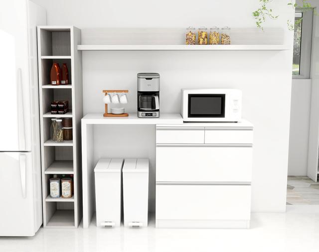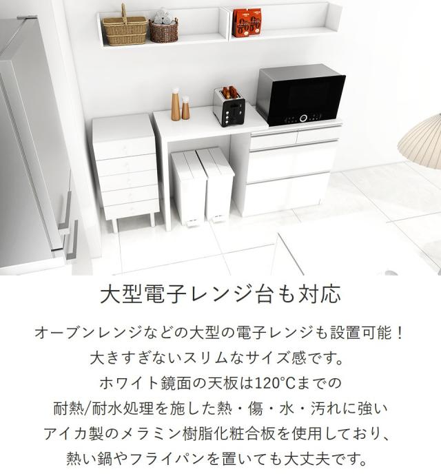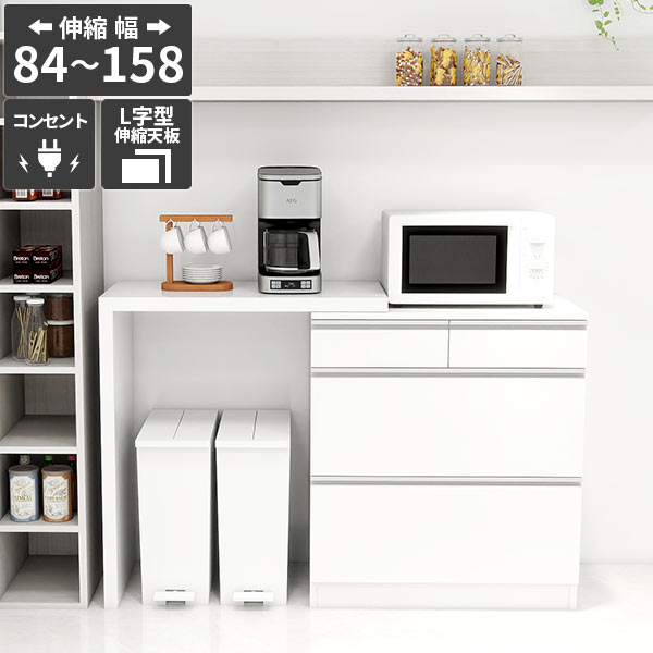 レンジ台 食器棚 キッチンボード 伸縮テーブル キッチンカウンター 電子レンジ台 おしゃれ コンセント付き ごみ箱収納 伸長 大型電子レンジ対応 収納 引き出し パントリー収納 日本製 鏡面 ホワイト 高級感 【RDW-0083/PlusOneL字/nail/約幅84〜158cm奥行44cm高さ94cm】 ☆