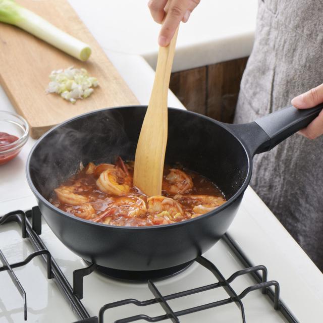 中華料理の達人、菰田欣也シェフがすすめるキッチンシリーズのフライパンです。たっぷり入る深型なので、炒め物の調理はもちろん、揚げ鍋や茹で鍋としてもお使いいただけます。軽量設計で扱いやすく、毎日の料理に活躍します。