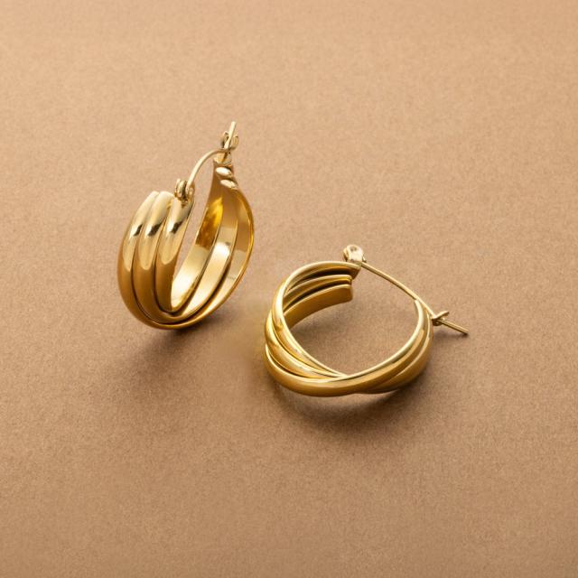 ひねりを加えた3連メタルが目を惹くフープピアス。立体的なシルエットがエレガントな艶めきを放ち、顔周りを華やかに演出します。流れるようにクロスしたデザインが、どの角度から見ても美しい大人なアクセントをプラスしてくれるひと品。