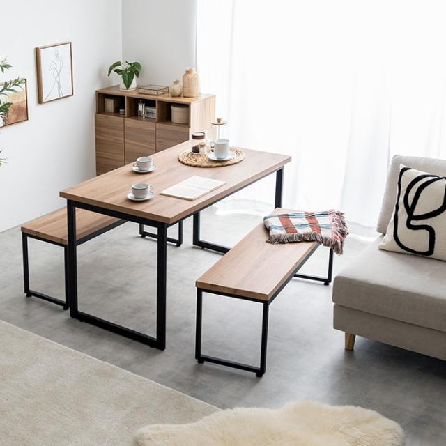 重厚感ある木目調×ブラックスチール脚がスタイリッシュなデザインで、カフェにいるような落ち着いた空間を演出します。また2台のベンチはテーブル下にすっきり収納できるため、省スペースなダイニングに。