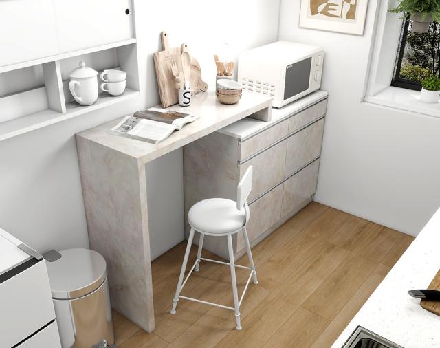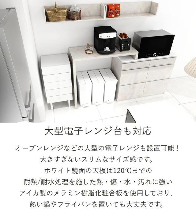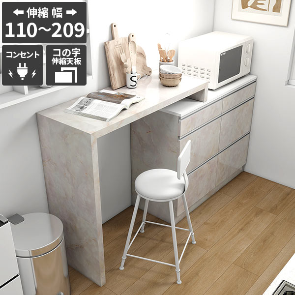 キッチンカウンター レンジ台 キッチン収納 食器棚 カウンターテーブル 引き出し コンセント付き 伸縮 おしゃれ 大容量 調理台 キッチンデスク カウンターテーブル 日本製 台所収納 大理石調 鏡面 マーブル 【RDW-1203/PlusOneコの字/MB/約幅110〜209cm奥行44cm高さ94cm】 ☆