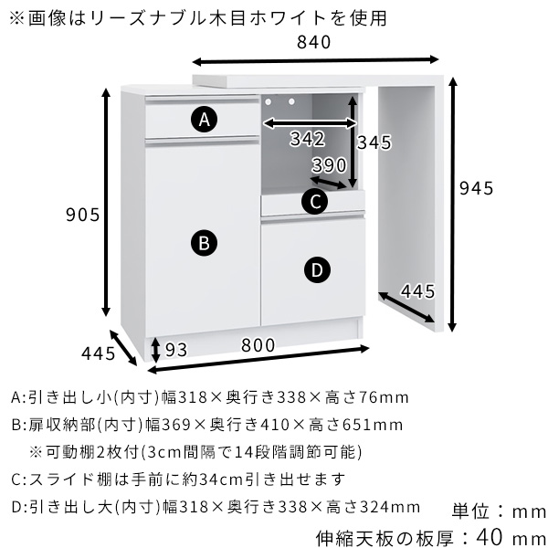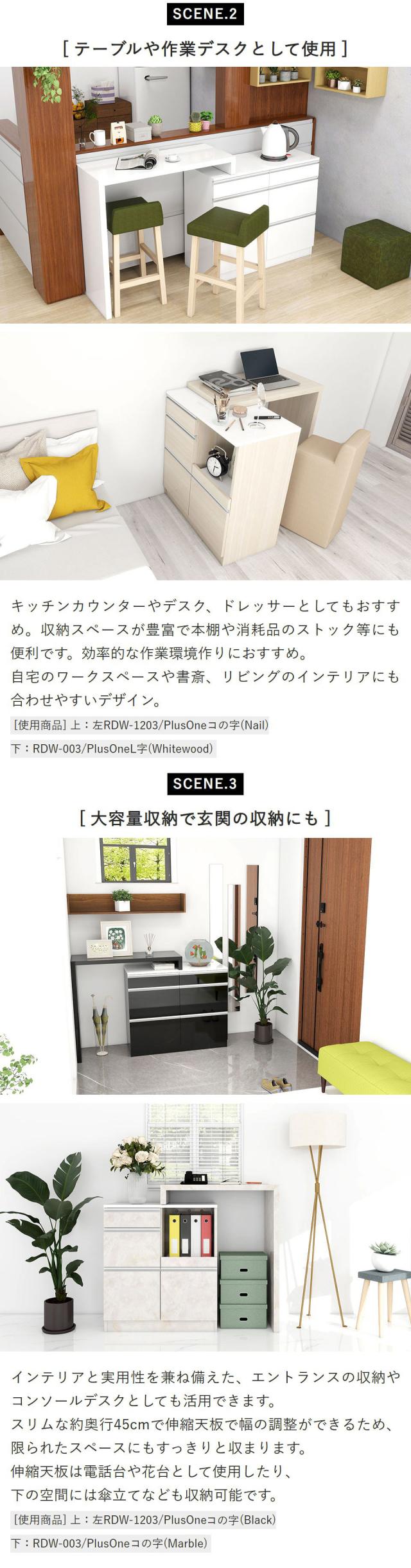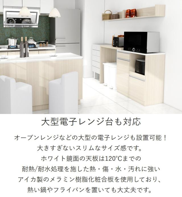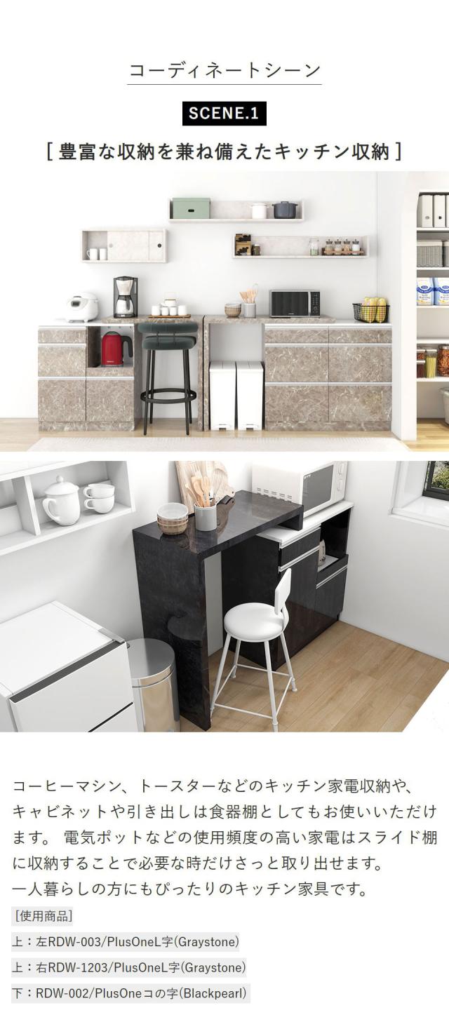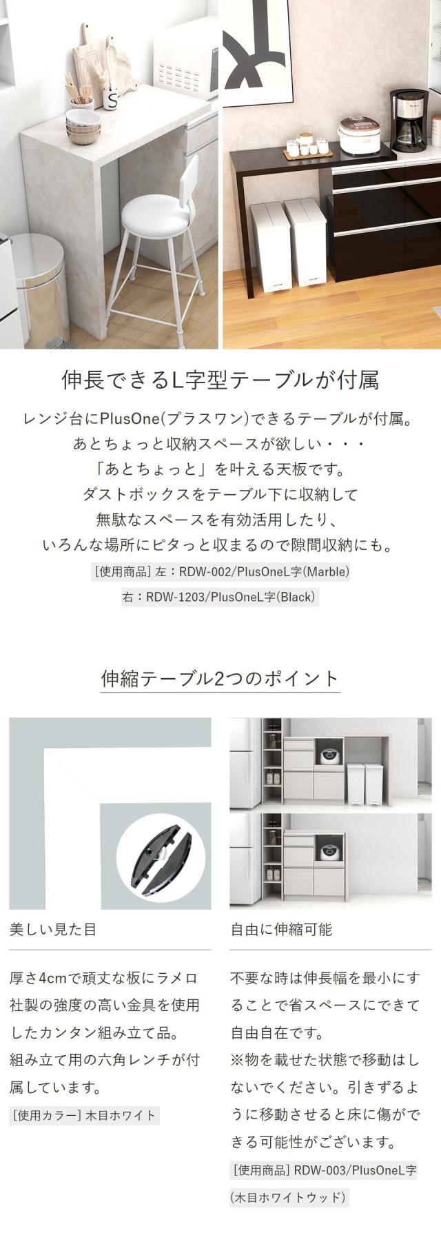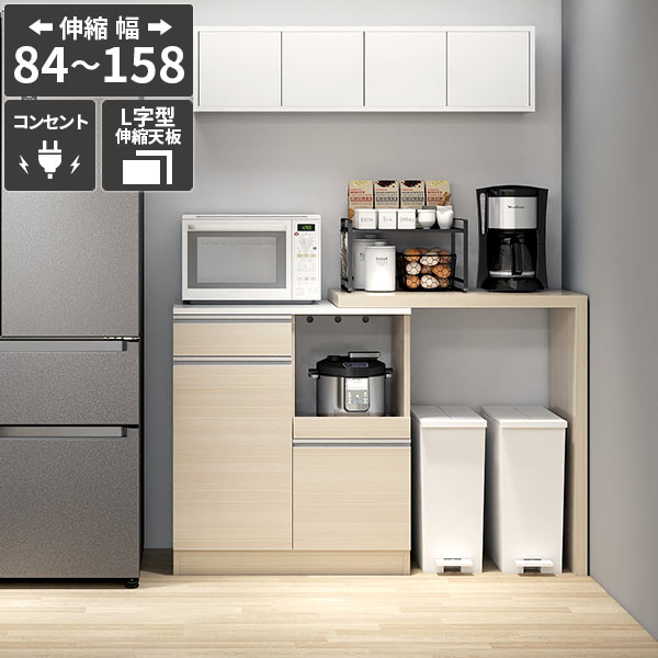 レンジ台 食器棚 キッチンボード 電子レンジ台 キッチンカウンター おしゃれ ごみ箱収納 コンセント付き 伸縮テーブル 伸長 大型電子レンジ対応 収納 引き出し パントリー収納 木目調 台所 鏡面 ホワイトウッド 【RDW-002/PlusOneL字/WW/約幅84〜158cm奥行44cm高さ94cm】 ☆