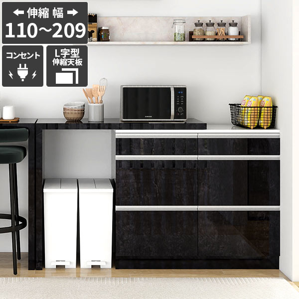 キッチンカウンター 食器棚 レンジ台 キッチン収納 おしゃれ 台所 伸縮テーブル 作業台 カウンターテーブル レンジラック 電子レンジ台 大型レンジ台対応 大容量 キャスターなし 台所 大理石調 ブラック 鏡面 【RDW-1203/PlusOneL字/BP/約幅110〜209cm奥行44cm高さ94cm】 ☆