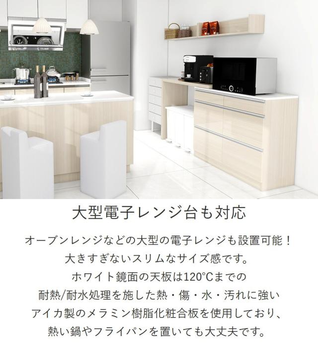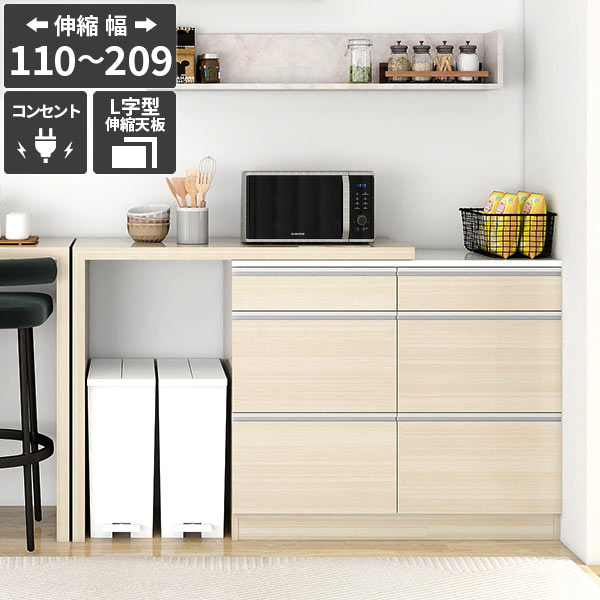 レンジ台 食器棚 キッチンボード 電子レンジ台 キッチンカウンター おしゃれ ごみ箱収納 コンセント付き 伸縮テーブル 伸長 大型電子レンジ対応 収納 引き出し パントリー収納 木目調 鏡面 ホワイトウッド 【RDW-1203/PlusOneL字/WW/約幅110〜209cm奥行44cm高さ94cm】 ☆
