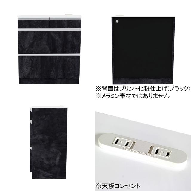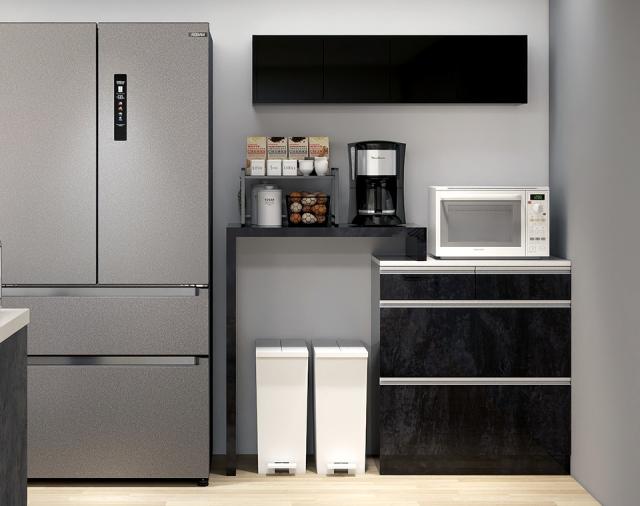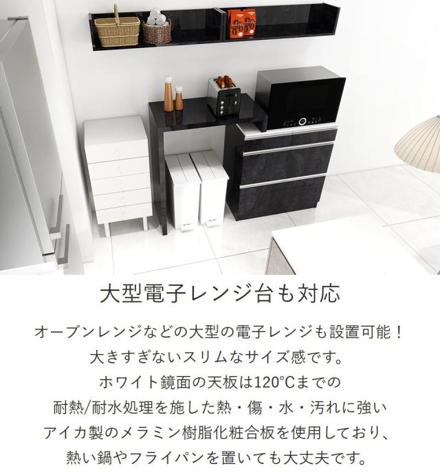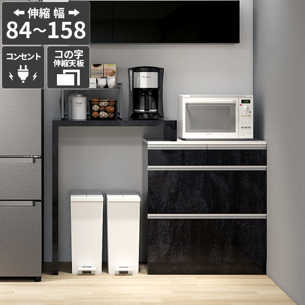 レンジボード 食器棚 電子レンジ台 キッチンカウンター 引き出し 炊飯器 レンジラック 台所収納 おしゃれ コンセント 北欧 ゴミ箱上ラック 伸長テーブル キッチン収納 大容量 日本製 大理石調 ブラック 鏡面 【RDW-0083/PlusOneコの字/BP/約幅84〜158cm奥行44cm高さ94cm】 ☆
