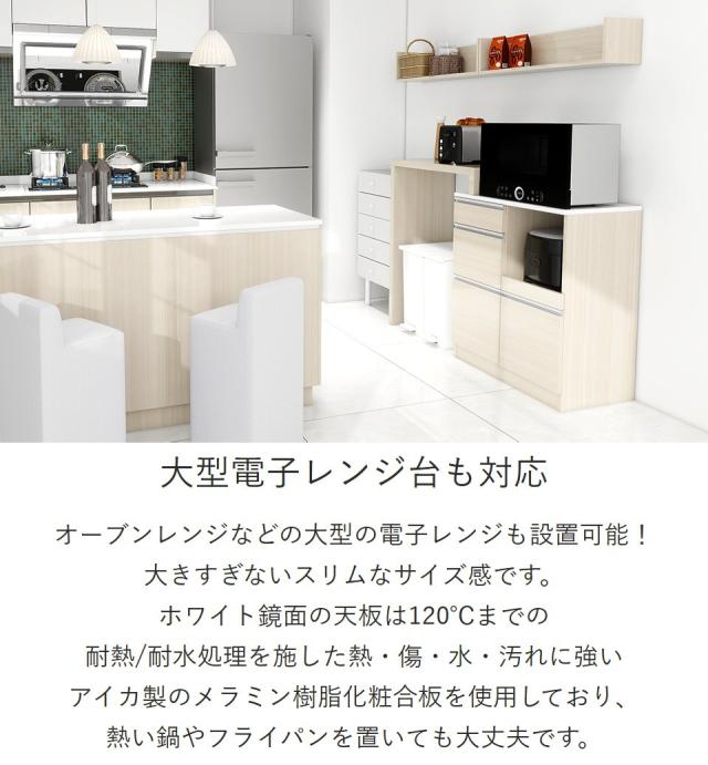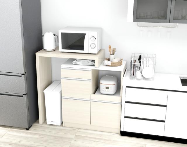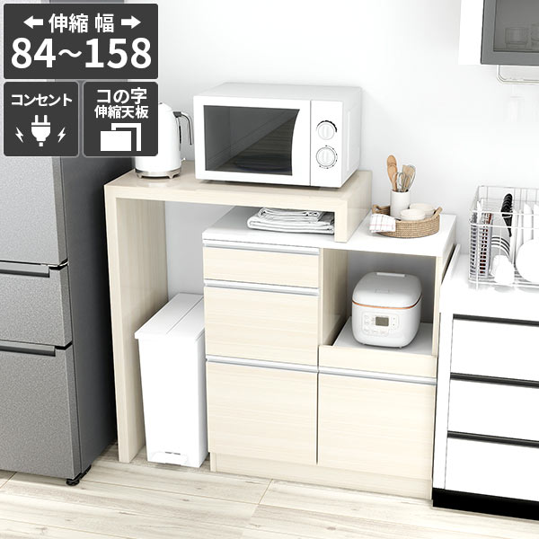電子レンジ台 キッチンカウンター コンセント付き 大型電子レンジ対応 食器棚 作業台 カウンターテーブル レンジボード ゴミ箱収納 炊飯器 引き出し スチームオーブンレンジ台 木目調 鏡面 ホワイトウッド 【RDW-003/PlusOneコの字/WW/約幅84〜158cm奥行44cm高さ94cm】 ☆