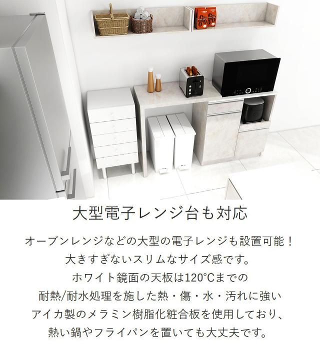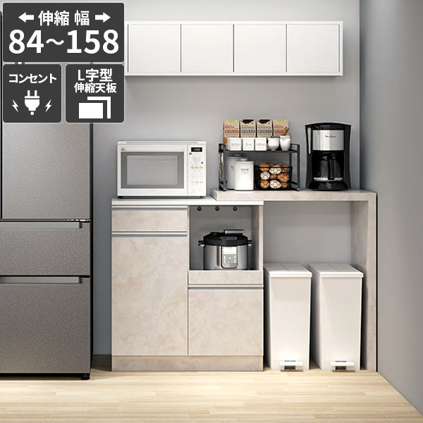 レンジボード 食器棚 電子レンジ台 キッチンカウンター 引き出し 炊飯器 レンジラック 台所収納 おしゃれ コンセント ゴミ箱上ラック 伸長テーブル キッチン収納 大容量 北欧 日本製 大理石調 鏡面 マーブル 【RDW-002/PlusOneL字/MB/約幅84〜158cm奥行44cm高さ94cm】 ☆