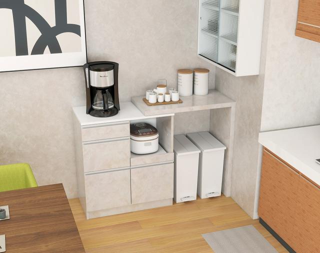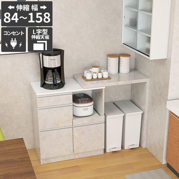 キッチンボード レンジ台 伸縮 キッチンカウンター おしゃれ コンセント付き 食器棚 伸縮テーブル 大容量 カウンターテーブル 引き出し 炊飯器 トースターラック 電子レンジ台 日本製 大理石調 鏡面 マーブル 【RDW-003/PlusOneL字/MB/約幅84〜158cm奥行44cm高さ94cm】 ☆