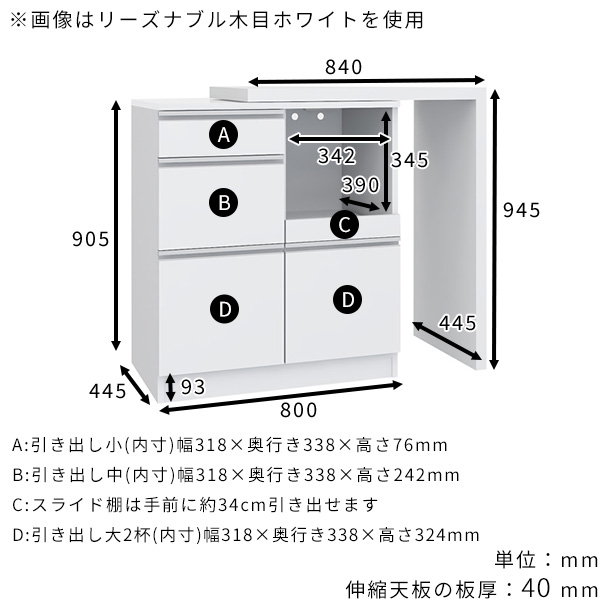 耐荷重:約天板50kg/スライド棚15kg/引出し(小)3kg(中・大)10kg